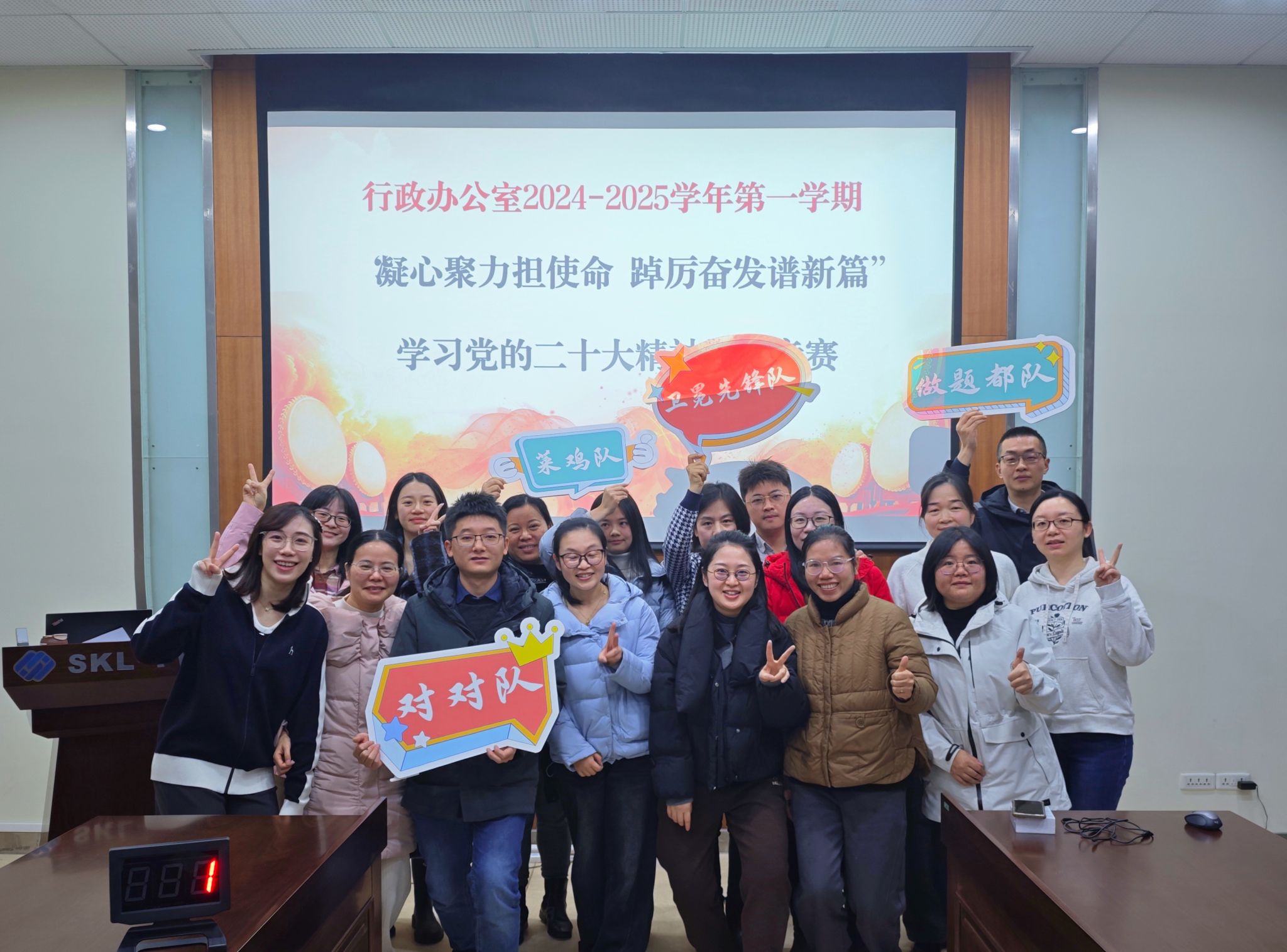 2024年12月12日上午,为深入学习贯彻党的二十届三中全会精神和全国教育大会精神,进一步加强党纪学习教育,推进党建知识学习走深走实,全面提高党员党性意识和政治素养,学院行政教工党支部带领行政办公室教工顺利举办了以“凝心聚力担命 踔厉奋发谱新篇”为主题的党建知识竞赛。 本次知识竞赛题目涵盖了党的二十届三中全会精神、全国教育大会精神、《中国共产党章程》《中国共产党纪律处分条例》等内容,设置个人题、团队题...