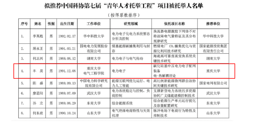 近日,经组织推荐和网络评审、会议评审等程序,中国电机工程学会确定了8位拟推荐至中国科协第七届“青年人才托举工程”项目被托举人,我院丰昊副教授以项目“碳化硅基中压电力电子配网装备电-热解耦理论”入选。碳化硅器件的优良特性为实现中压电力电子装备的高效率和高功率密度提供了新的契机。但目前并未充分发挥碳化硅器件优势,其中系统内部的电-热耦合是装备功率密度和可靠性制约的关键作用因素。申请人针对这一难题,依托...