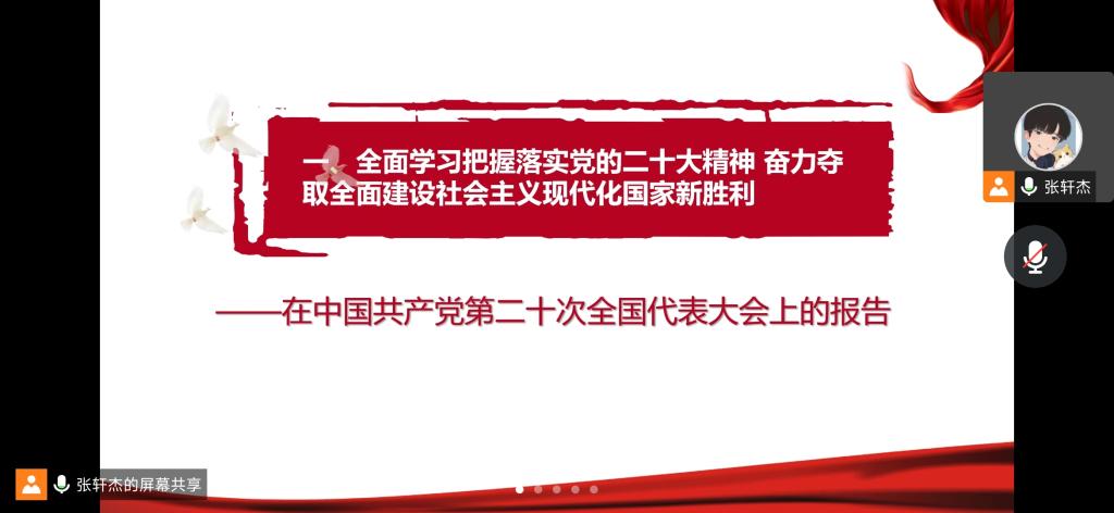 2022年11月11日13:00,无码av 本科生一支部在线上开展了本学期第二次组织生活,本次组织生活以“献礼二十大,强国新征程”为主题,由张轩杰同志主持,一支部全体党员参加。张轩杰同志带领大家回顾了党的二十大的主要内容和现实意义,号召全体党员同志要在全面学习、全面把握、全面落实上下功夫,坚定不移把党的二十大提出的目标任务落到实处,奋力夺取全面建设社会主义现代化国家新胜利。支部同志们一同学习了中央全面深...