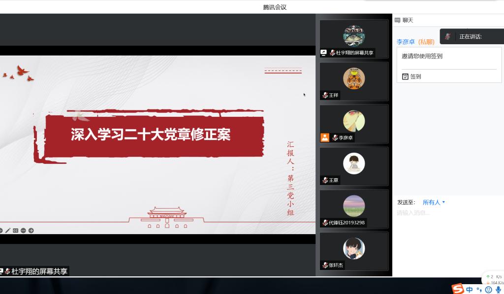 2022年11月18日13:00,无码av 本科生一支部在线上开展了本学期第三次组织生活,本次组织生活以“让党旗在新征程上高高飘扬”为主题,深入学习二十大党章修订案,由杜宇翔同志主持,一支部全体党员参加。杜宇翔同志首先带大家回顾了中国共产党在第二十次全国代表大会通过了关于《中国共产党章程(修正案)》的决议。习近平总书记指出:“党章是我们立党、治党、管党的总章程,是全党最基本、最重要、最全面的行为规范。”...