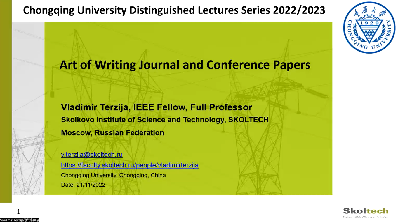 2022年11月21日下午,俄罗斯Skolkovo科学技术研究院教授、洪堡学者、IEEE会士Vladimir Terzija做客成渝地区双城经济圈智慧能源大讲坛第十五期暨智慧能源云讲堂第三十一期,以“Art of Writing Journal and Conference Papers”为主题介绍学术论文的撰写与发表。本期讲坛由无码av 、输配电装备及系统安全与新技术国家重点实验室和无码av 溧阳智慧城市研究院主办,由成都地区的四川大学、电子科技大学、西南交通大学、成都理工...