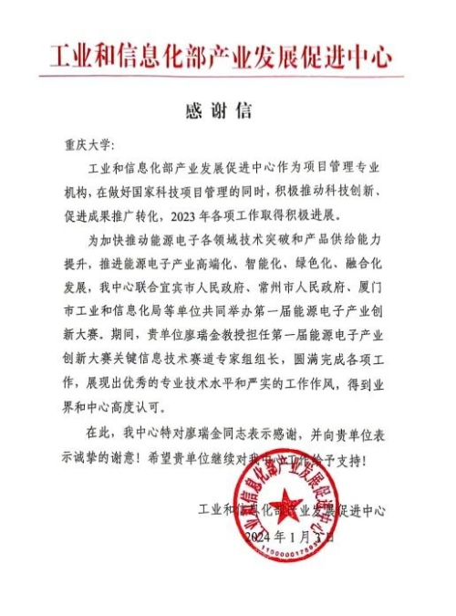 Recently, the Industry Development Promotion Center of the Ministry of Industry and Information Technology (referred to as the Center) specially delivered a letter of thanks to Professor Liao Ruijin of Chongqing University and the School of Electrical Engineering.