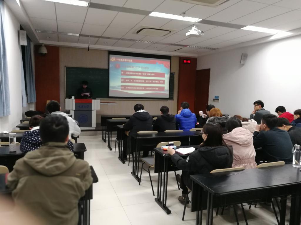 活动一开始,戴太阳同志通过以结合PPT讲解的形式向大家展示了1977年恢复高考以来高考的发展、变与不变。40年来高考的发展经过了制度恢复期、改革调整期、扩招发展期和试点深化期四个阶段。关于高考制度的变与不变,主讲人分考试时间、题型、考生年龄限制等几个方面向大家进行了介绍。通过这一部分的讲解,支部同志对40年来高考的发展史有了更为详细的了解。