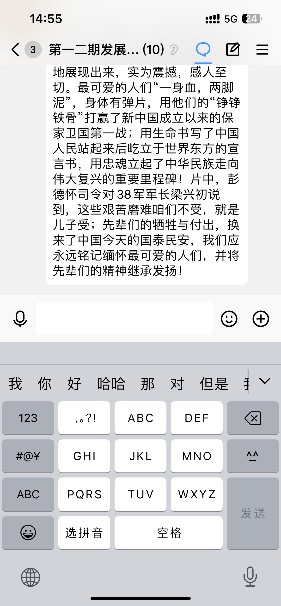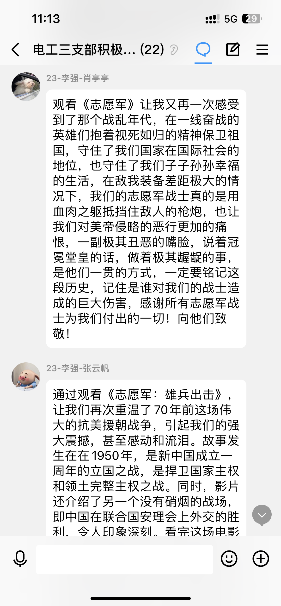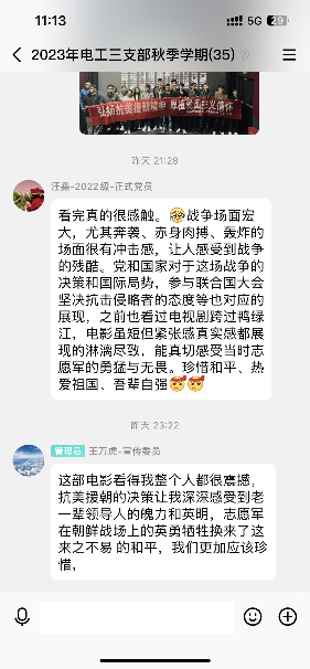 观影结束后,大家纷纷在党支部工作群中发表自己的感悟。我们今天的和平安宁、幸福生活是用千千万万革命先烈的鲜血和生命换来的,最可爱的人们“一身血,两脚泥”用他们的“铮铮铁骨”打赢了新中国成立以来的保家卫国第一战,用生命书写了中国人民站起来后屹立于世界东方的宣言书,用忠魂立起了中华民族走向伟大复兴的重要里程碑!我们要铭记历史,学习并发扬抗美援朝精神,坚守初心使命,以更加饱满的热情、更加昂扬的斗志、更加饱满的工作热情积极投身到科研学习和未来的工作中。