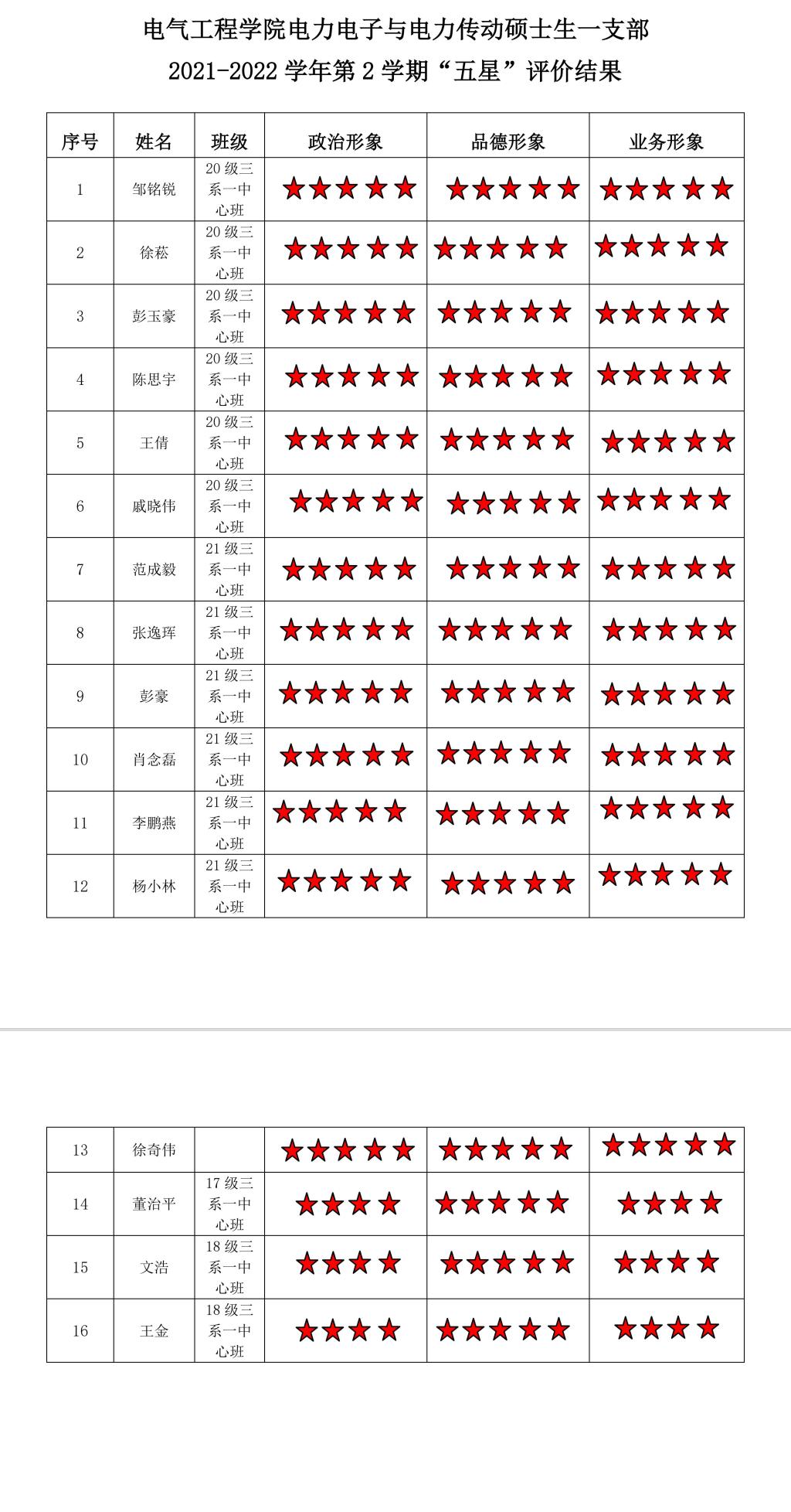 无码av 电力电子一支部2021-2022学年第二学期“五星评价结果”