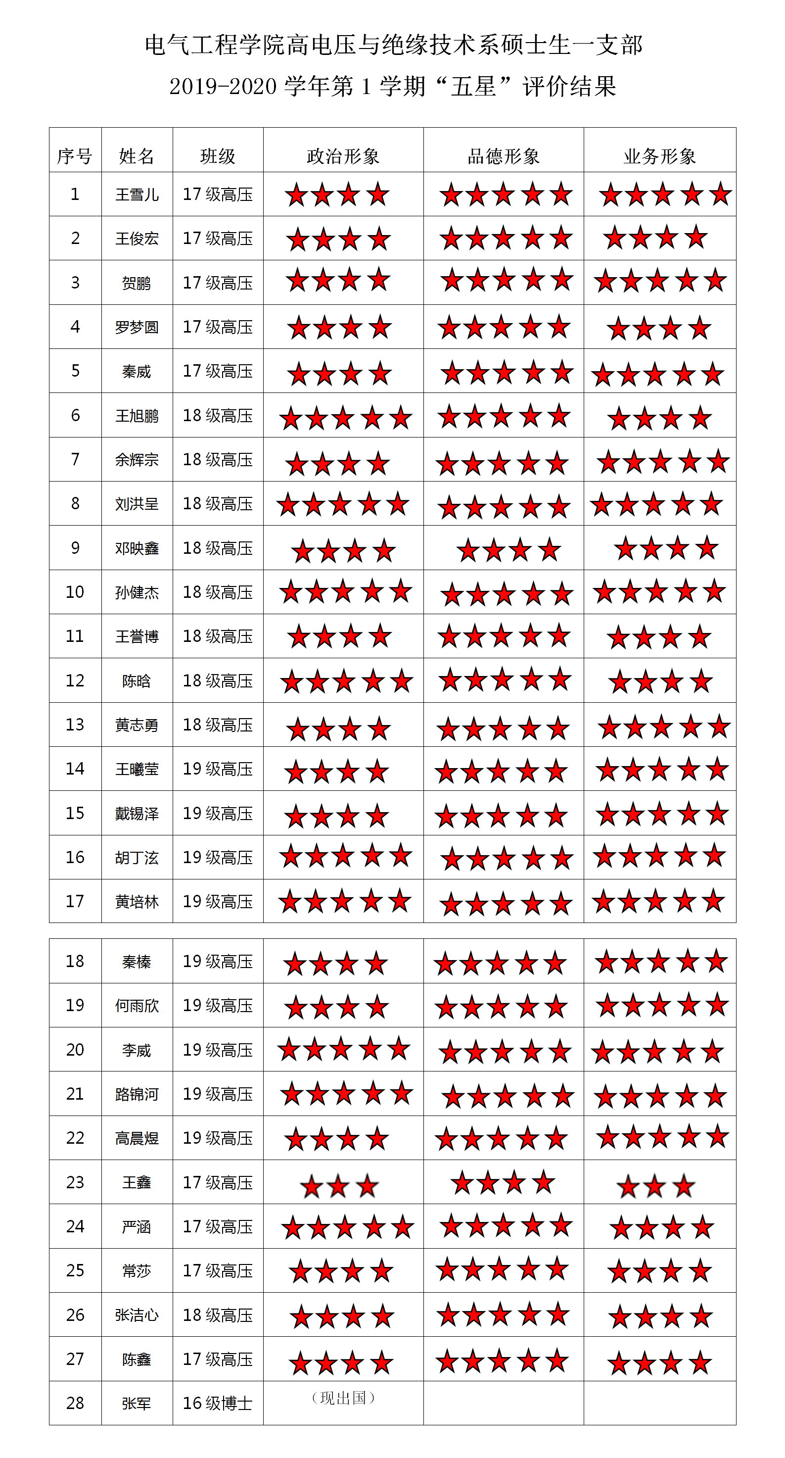 无码av 高电压与绝缘技术第四支部 2019-2020学年第1学期“五星”评价结果