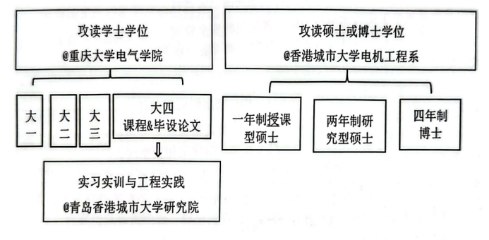 “3+1+X”项目针对重庆大学相关专业优秀的本科学生,制定了3年国内大学本科,1年衔接课程和一年制授课型硕士或两年制研究型硕士或四年制博士学习模式。其中第四年的衔接课程在港城大青岛院完成,符合港城大硕/博士入学资格的学生可在第五年赴港城大进行硕/博士课程学习。