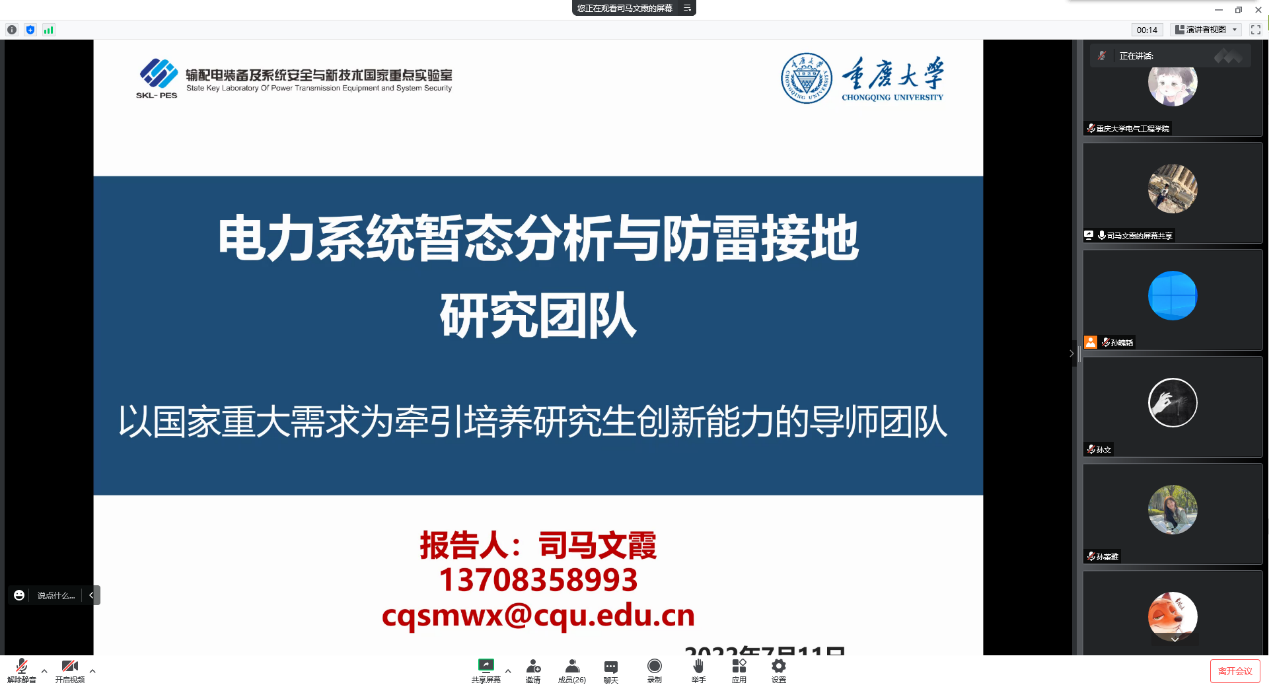 开营典礼结束后,进行了团队或导师推介宣传、线上交流等。电力系统控制与保护、空间电力利用与大功率远距离无线能量传输、生物电工、电力装备自然灾害防御、电力装备数字化与智能化、先进电工材料、电气设备智能检测与新型绝缘材料、电力系统暂态电压分析与防雷接地、新能源发电与电驱动系统技术、碳化硅电力电子器件可靠性研究、低碳电力能源系统智能运行与规划、高压放电等离子体及其应用研究等11个团队围绕研究方向、导师队伍、科研平台等进行了推介宣传,以展示团队优势和特色。各团队或导师从专业基础知识、综合能力、英语水平等方面对营员进行了全方位的考察和深入交流沟通。