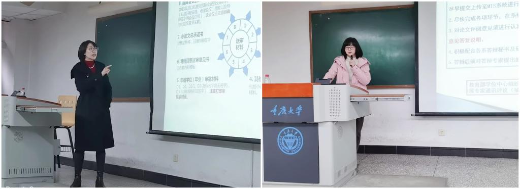 研究生办公室沈晗老师、王中香老师详细介绍了博士、硕士研究生的学位申请流程,毕业论文相关要求及时间安排,提醒毕业生珍惜在校时光,合理安排论文工作进度,与导师、学院加强沟通,保质保量的完成各项论文工作确保顺利毕业。