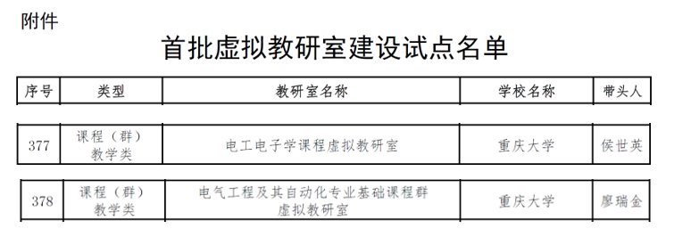 共有6个项目入选,其中我院廖瑞金教授牵头的“电气工程及其自动化专业基础课程群虚拟教研室”、侯世英教授牵头的“电工电子学课程虚拟教研室”项目获批立项。