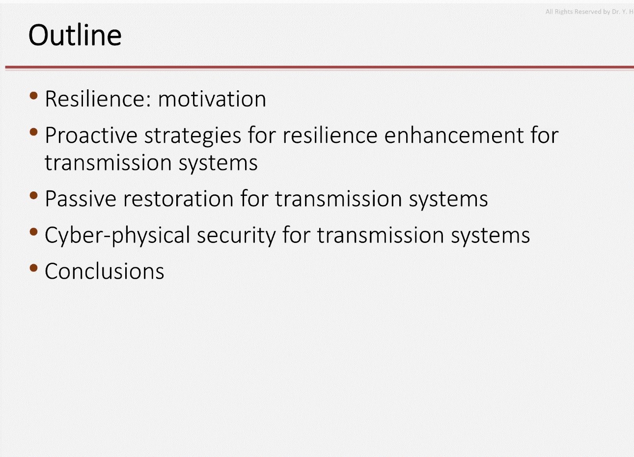 除此之外,侯教授还对信息物理系统进行了简要介绍。侯教授强调,弹性系统是满足“新常态”条件的关键要求,其弹性运行包含连续反应、在极端事件各阶段的协调运作策略等新的维度,想要建设一个鲁棒性强的系统并确保关键部件的可生存性,则需要更新当前的运营和规划方法。