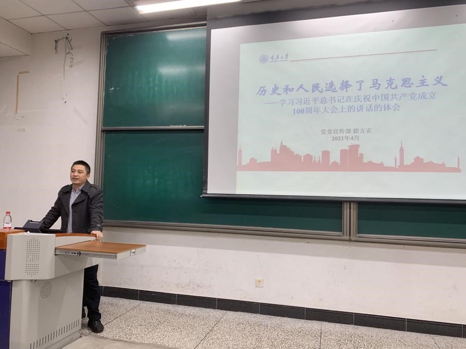 党委宣传部徐方正以“为什么说历史和人民选择了马克思主义”为主题第三次集中课堂教学,徐老师从解读习近平总书记在庆祝建党一百周年大会上的讲话精神为引,从救亡图存方向的转变、早期的马克思主义者、为何选择马克思主义、事实证明选择的正确等四个方面,阐述了中国共产党为什么能,马克思主义为什么行,中国特色社会主义为什么好。