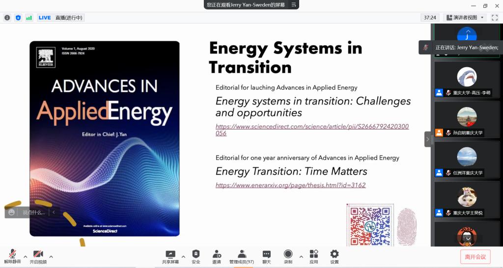 2021年11月6日下午,欧洲人文与科学院院士,Applied Energy主编严晋跃(Jerry Yan)教授受邀做客“成渝地区双城经济圈智慧能源大讲坛”,担任讲坛第二期的主讲嘉宾,以“Transitions of Future Energy Systems Towards Carbon Neutrality”为主题开讲。“成渝地区双城经济圈智慧能源大讲坛”是贯彻落实成渝双城经济圈国家发展战略,深化成渝两地教育资源合作共享的重要举措。讲坛由无码av