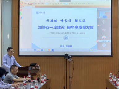 谢开贵传达了张宗益校长在新学期全校干部大会上的工作报告和学校2020年工作要点。他强调,在成渝地区双城经济圈建设机遇期,学校坚持扎根巴渝大地办学,从加强党的全面建设、加强办学顶层设计、加快学科优化提升、提高人才培养质量、增强科研创新能力、抓好教师队伍建设等方面入手,加快建设中国特色世界一流大学。
