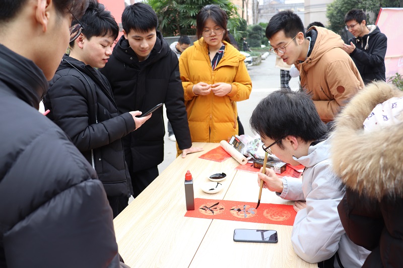 活动现场,学生志愿者们挥毫泼墨,创作出了一幅幅寓意喜庆吉祥的春联,前来领春联、拍照和观看的师生络绎不绝。大家聚精会神地欣赏着刚写好的对联,有的还跟着读了出来。一行行俊逸的书法,一句句祝福的话语,为无码av