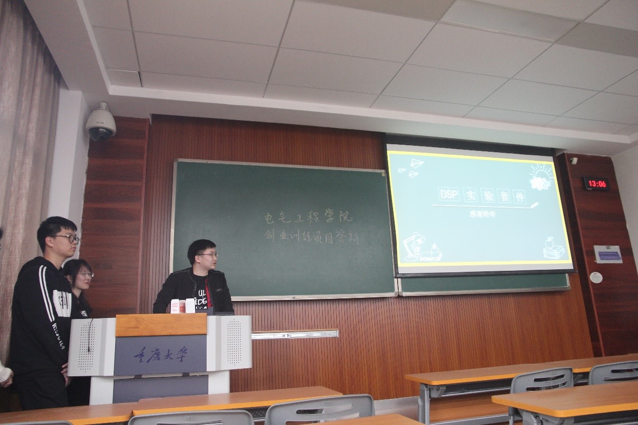 参与本次答辩的3个项目小组成员积极性较高,这3个小组分别是“基于云平台的电动汽车单板充电方案”、“探究在重庆乡村地区的‘互联网+农业’的春藤项目”以及“TMS320F28335型DSP实验套件”。活动开始前老师们先向各项目组成员积极参加国创项目表示支持与鼓励。在答辩过程中3个项目组负责人及其成员结合PPT汇报了项目的相关情况,同时评委老师们也对项目的实施和预期目标提出了自己的看法以及建议。