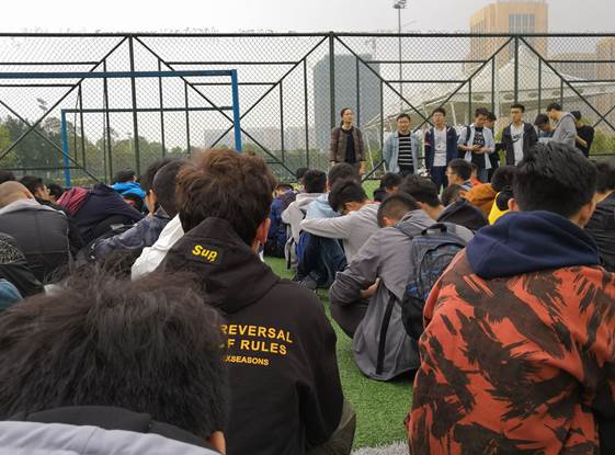 2018级辅导员喻惠老师和董轶男老师组织学院18级学生在风雨操场集合参加运动会方阵选拔。此外,还有部分学生会干事负责相关事宜,协同老师一起选拔方阵。