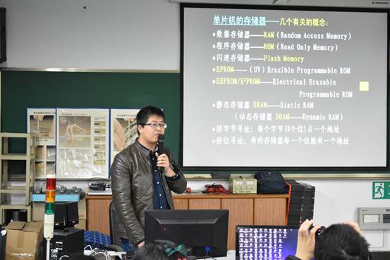 19:00整,所有培训学员已经准时到场落座,培训正式开始。本次培训的第一个环节是必要软件的安装。在全瑞坤老师的详细讲解下,同学们掌握了必备软件的下载和安装过程。随后,培训进入到第二个环节——51单片机的介绍和使用。老师通过课件,向同学们细致地讲解了51单片机管的基本结构和它的实际应用。从各个组件,例如51单片I/O口的使用,编码键盘的设计、使用以及存储器、堆栈、SFR;再到两种单片机结构:普林斯顿结构和哈佛结构,定时器和计数器的编写方法,老师循序渐进地为同学们整理出一个单片机的清晰框架。同学们全神贯注,专心致志地聆听着老师的讲解,一丝不苟地记着笔记。为了使同学们能有更深刻的理解,老师还通过分析具体项目,手把手带着同学们使用定时器和计数器。最后,老师为同学们介绍了四种主要的通信方式和A/D转换器。