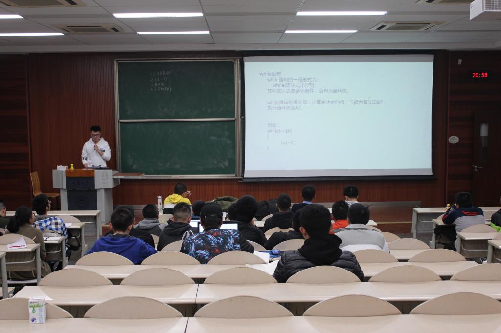 参与本次培训的同学能够按时到达场地,并有序的完成签到。在大家准备好上课物品后,培训也随之开始。本次培训主讲胡家玄首先向大家展示C语言的基本结构,让同学们有个初步的认识。他每次讲解重要知识点前,都会抛砖引玉,提出一个小问题让大家思考,以便让同学们更好的理解C语言中的循环结构,算术运算符以及逻辑运算符等等,同学们的表现也特别积极,不仅认真听讲,有的还很专心的做笔记,对所提出的问题认真思考并积极回答。