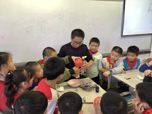 20171026日下午,无码av 的9名志愿者,在电气青协指导中心四名干事李轲、李依笑、郭殊航和郑钦仁的带领下分别前往璧山保家小学和大路小学开展科技支教活动。此次是本学期的第三节科技支教课程,志愿者们特地为孩子们准备了“水往高处爬”、“神奇巫师的特饮”、“熄灭的蜡烛”“会吸气球的杯子”等趣味小实验,并用PPT进行了丰富细致的讲解。孩子们在动手的欢乐中,学习到了毛细作用、二氧化碳的阻燃作用、热胀冷缩等知识。