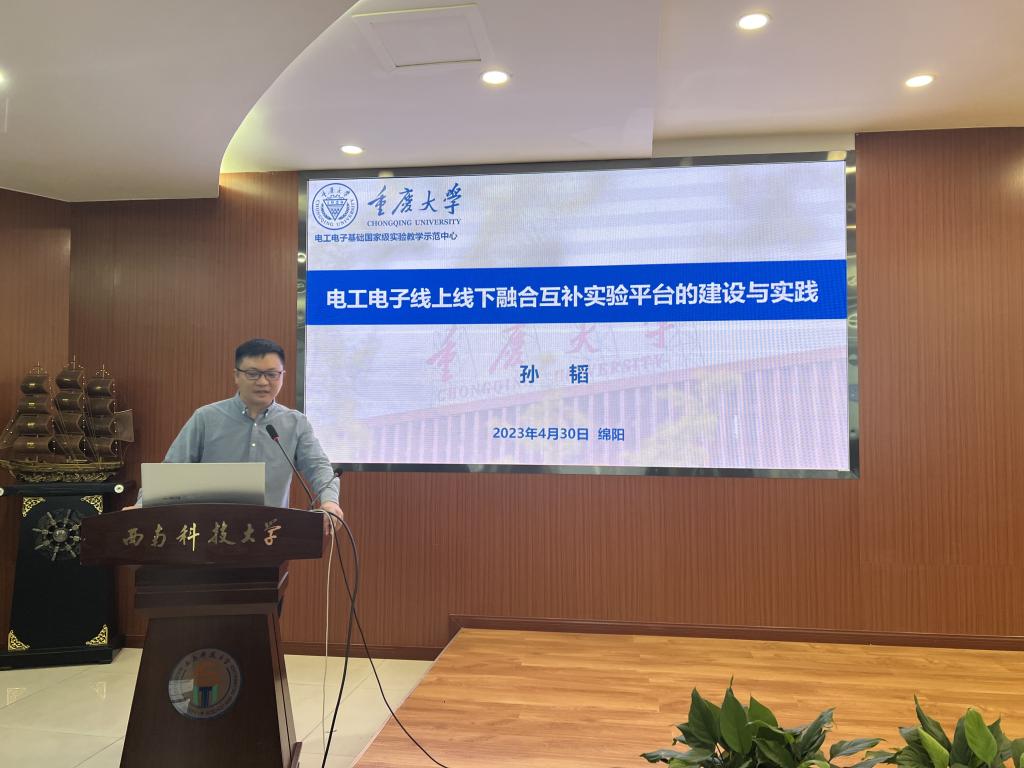 430日举行的教学研讨会上,来自全国高校的8位专家和同行教师作大会报告,分别围绕实验教学内容与课程思政改革、实验教学模式改革、实验案例设计与推广、实验室及实验教师队伍建设等主题进行了分享。中心教师孙韬以电工电子基础实验教学示范中心近几年的实验教学平台建设实践经验作了“电工电子线上线下融合互补实验平台的建设与实践”的分享报告,介绍了在教育数字化转型背景下本校电工电子基础实验教学示范中心虚仿和远程实验平台建设概况、教学实施情况以及后续完善规划。