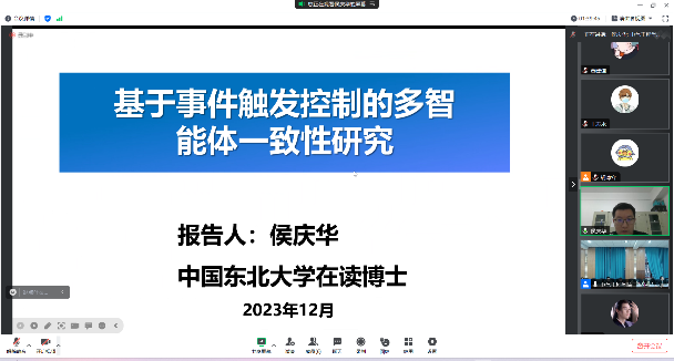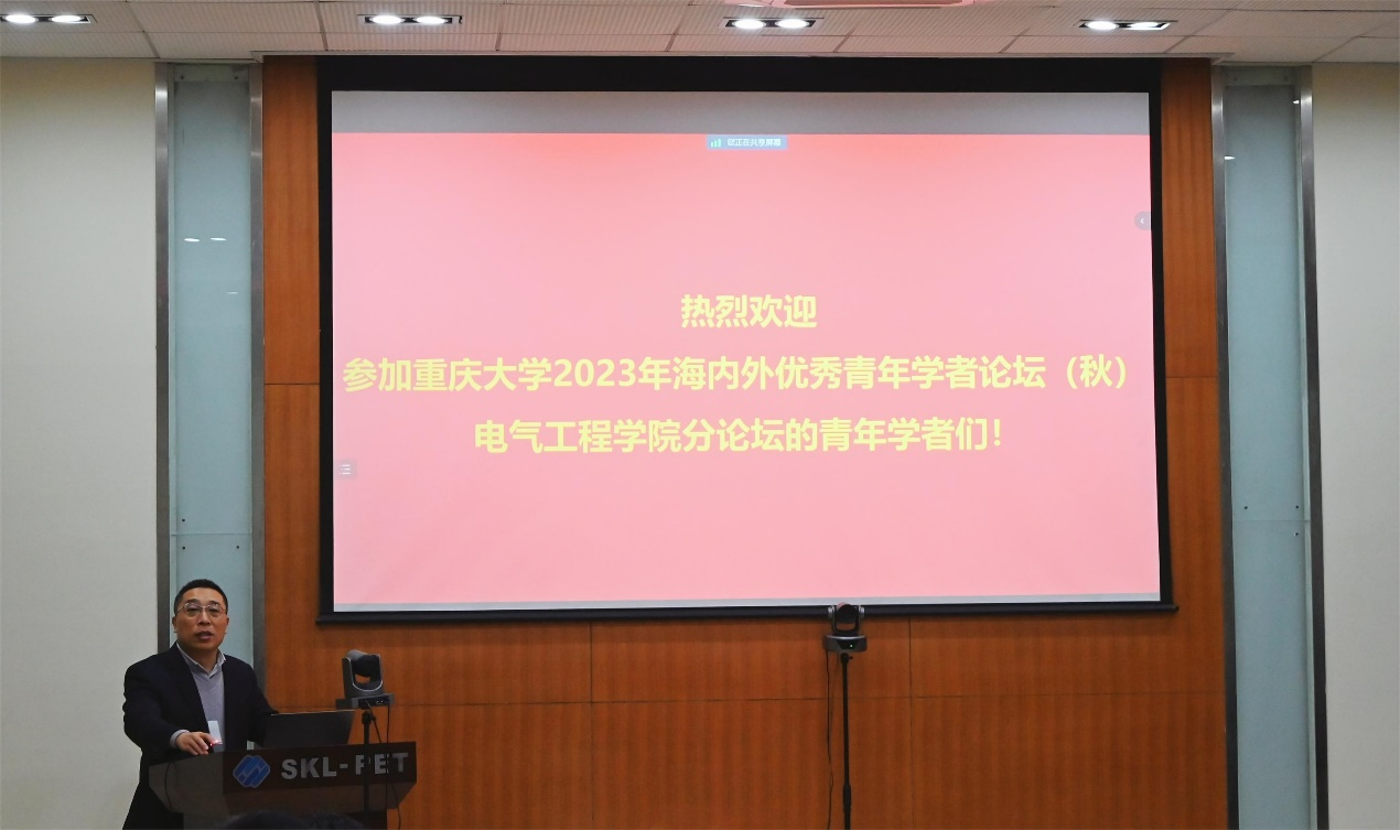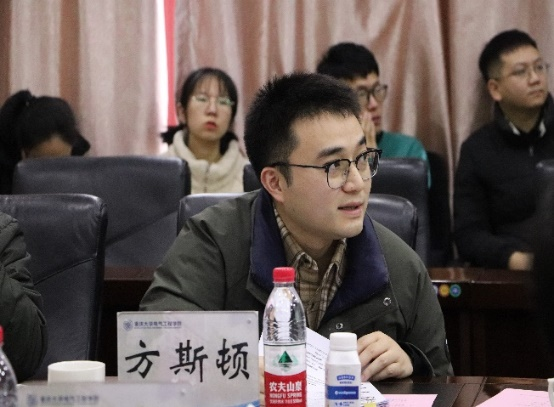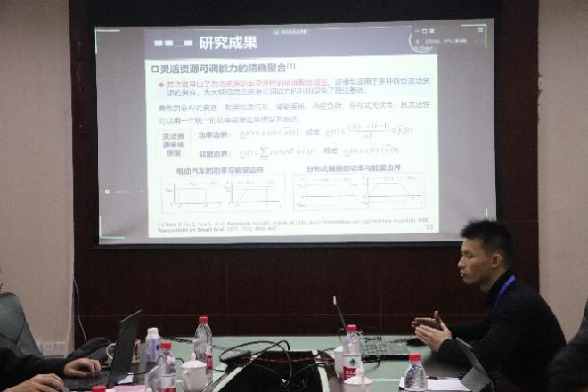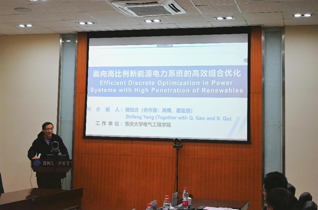 接着,电力系统及其自动化系教师代表杨知方教授做学术报告。杨知方就高比例新能源电力系统做了相关介绍,分享了构建电力系统机组组合的物理特征以及电力系统特征对分支定界的影响机理,并与参会的青年学者交流了相关看法。