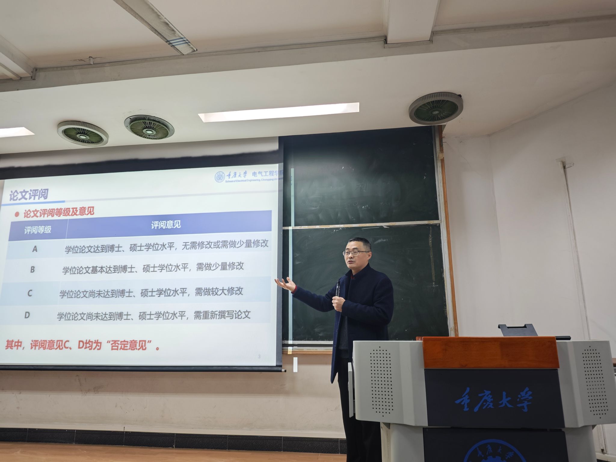 谢开贵向大家详细解读了学位论文评阅和抽检有关政策及管理规定,并通报了近两年学院学位论文的评阅和抽检情况,要求大家充分认识到学位论文工作的重要性,并根据国家学位条例以及学位授予标准,对照“问题论文”存在的一些典型特征修改完善毕业论文,切实保障论文质量,不负学院培养与期待,勇往直前,追求卓越。
