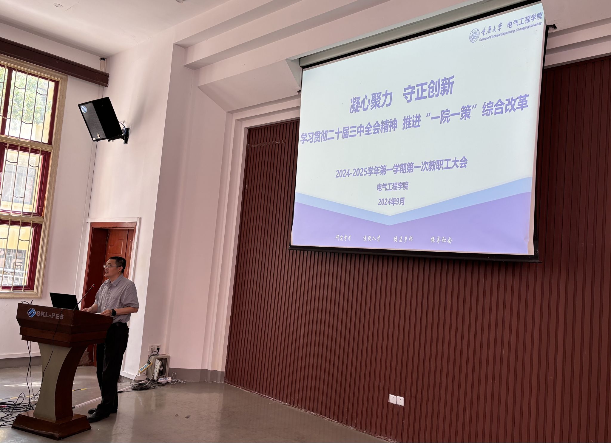 在六教6117报告厅召开2024-2025学年第一学期首次教职工大会。会议介绍了本年度新进教师,传达了学校最新精神并通报部署了学院新学期工作安排等。学院党委书记胡建林,院长谢开贵,党委副书记王晓静,副院长杜雄、杨鸣、王强钢,输变电装备技术全国重点实验室副主任李辉、曾礼强出席会议。大会由王晓静副书记主持。