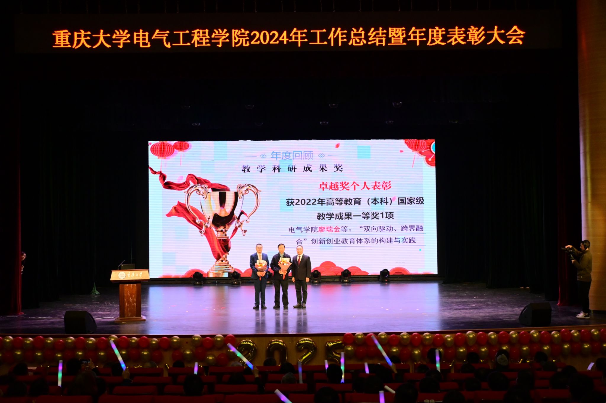 接着,学院对 2023 - 2024 年度在教学科研成果、人才队伍建设、教书育人等方面成绩卓著的先进个人予以表彰。党委书记胡建林代表学院为2022年高等教育(本科)国家级教学成果一等奖、卓越奖个人获得者廖瑞金,2021、2022年高等学校科学研究优秀成果奖自然科学一等奖、优秀奖个人获得者谢开贵两位老师献花,感谢其在教学科研的深海中披荆斩棘,推动学院学术巨轮破浪前行;胡建林、谢开贵代表学院为人才队伍建设奖获得者叶佳、杨丽君、郝建、曾正等优秀奖个人献花,感谢其为学院师资队伍的发展添砖加瓦、进一步稳固根基;胡建林、谢开贵代表学院为教书育人奖获得者,无码av