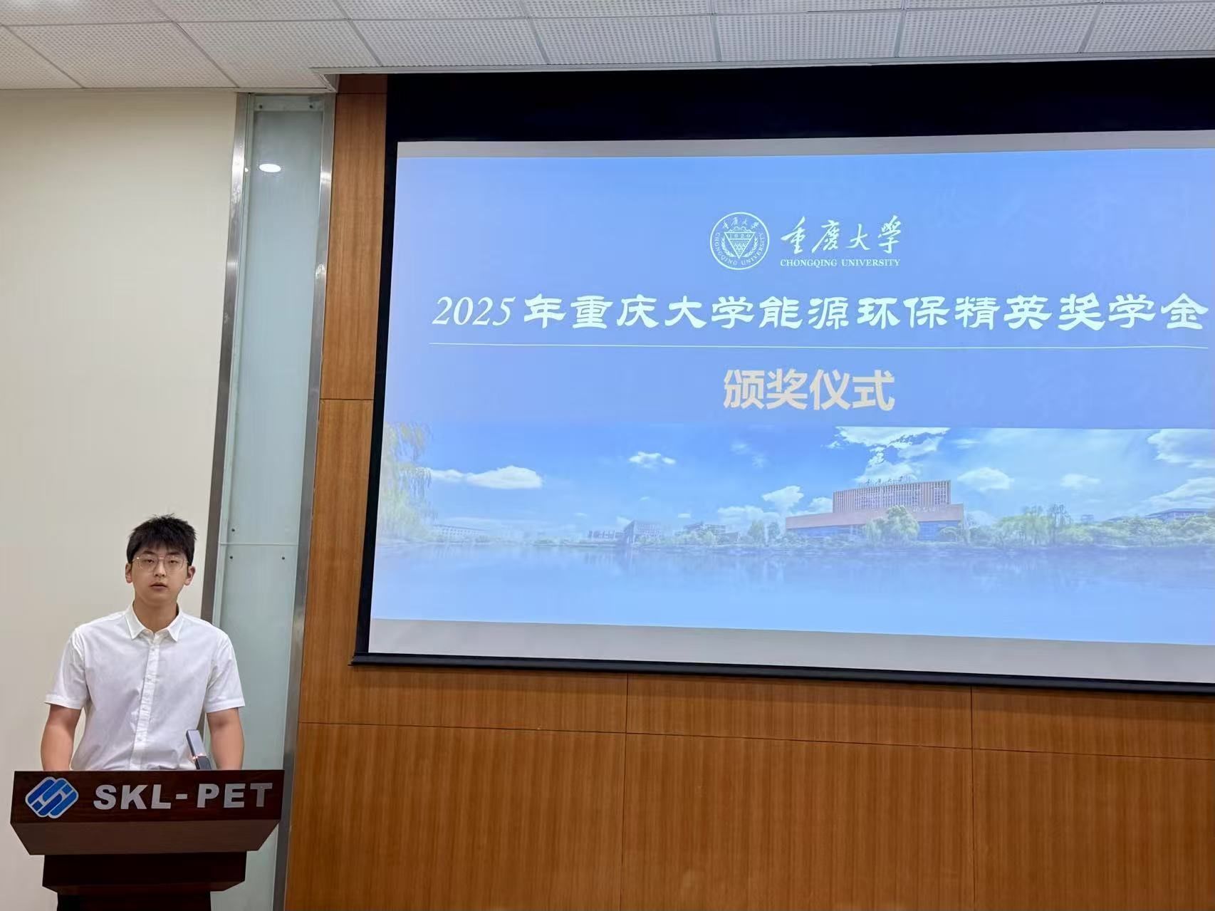 2022级硕士研究生牛思源发言。他向杭州格创新能源有限公司表达了诚挚的谢意和崇高的敬意,同时向母校表达深切的感恩。他谈到,这份荣誉既是肯定,更是责任和激励,激励同学们将所学知识转化为推动行业进步的力量,以认真踏实的态度扎根基层、锤炼本领,以优异的成绩回馈社会,在能源环保事业中挥洒青春汗水、书写精彩篇章。