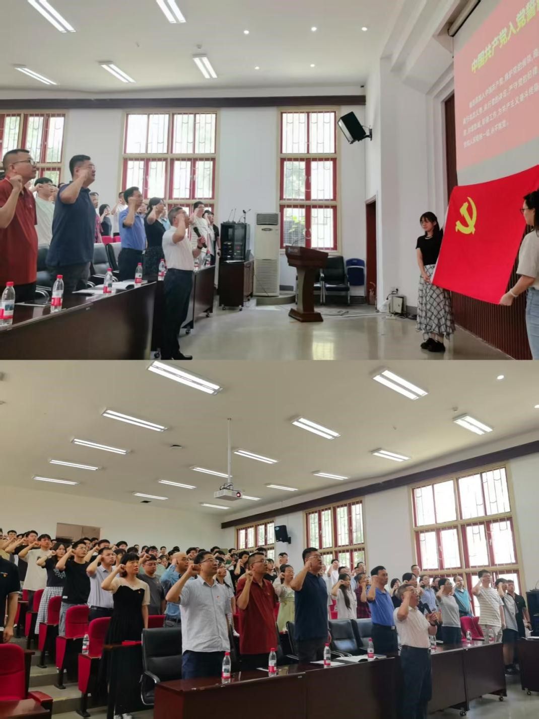 150余名新老党员佩戴党员徽章、面对鲜红的党旗,高举右手,回顾入党时的铮铮誓言和赤诚初心:“我志愿加入中国共产党......随时准备为党和人民牺牲一切,永不叛党。”教师党员代表黄嵩、学生党员代表许航分享交流成长经历,在掷地有声的发言中,重温入党初心,强化使命担当。