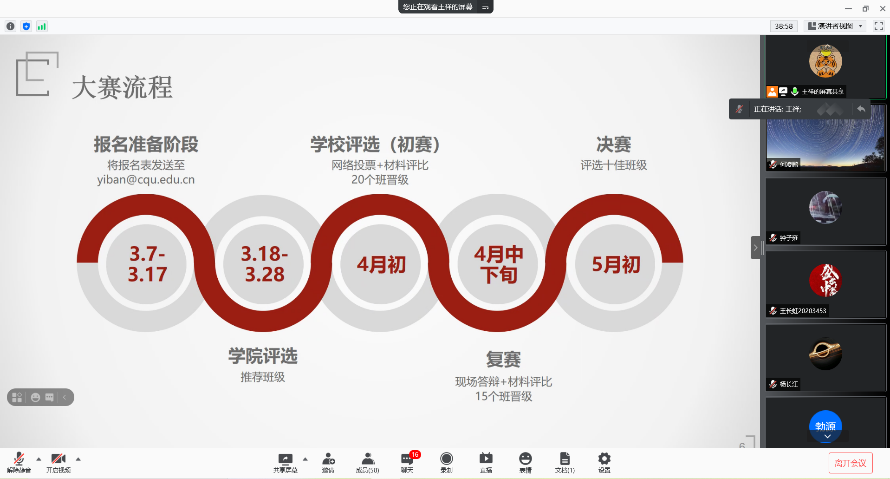 21时30分,新生十佳班级大赛报名培训正式开始。培训过程共包括活动简介、经验分享、现场答疑三个环节。活动简介过程中,王祥老师介绍了报名方式和大赛流程,并详细讲解了活动各阶段的举办时间、参选要求及评选标准。