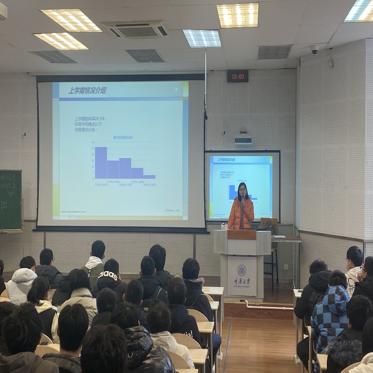 喻惠老师向同学们介绍了上一学期年级的学习情况,较大一下学期,年级整体成绩和挂科率有很大的提升,但是还需要同学们继续努力;喻老师鼓励大家积极参加创新创业竞赛,今年的互联网+大赛在无码av