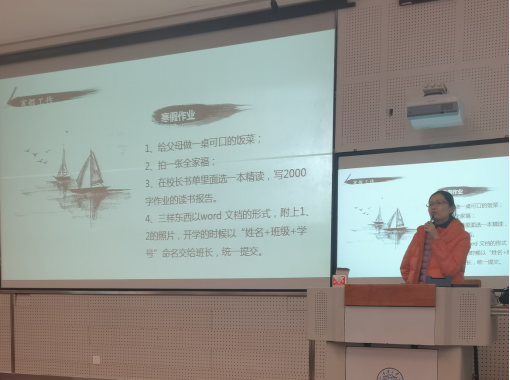 喻惠老师向同学们说明了放假时间和开学报道注册时间,从1月11日到2月27日。布置了寒假作业,对同学们的寒假生活提出了要求。同学们要减少不必要外出,尽量避免跨省域长途流动,不前往疫情中高风险地区和境外。