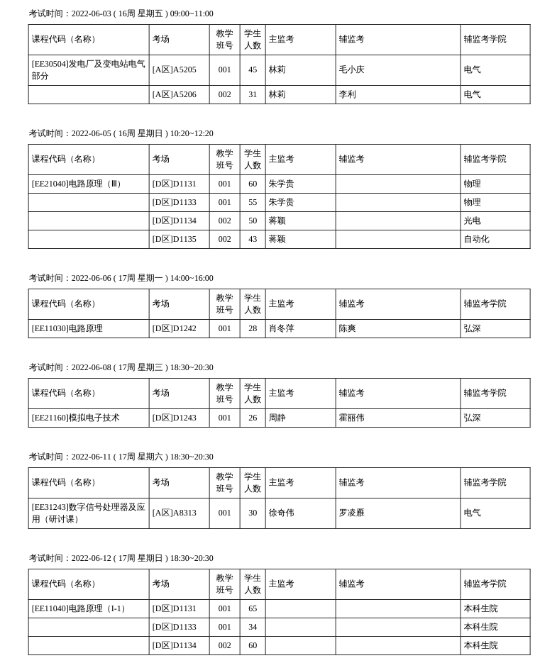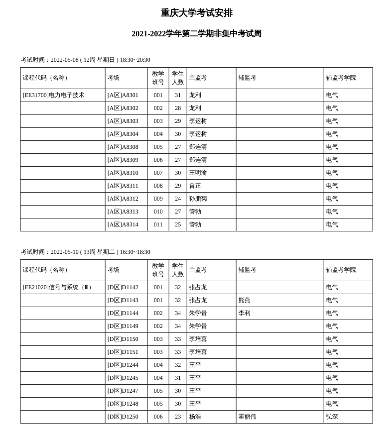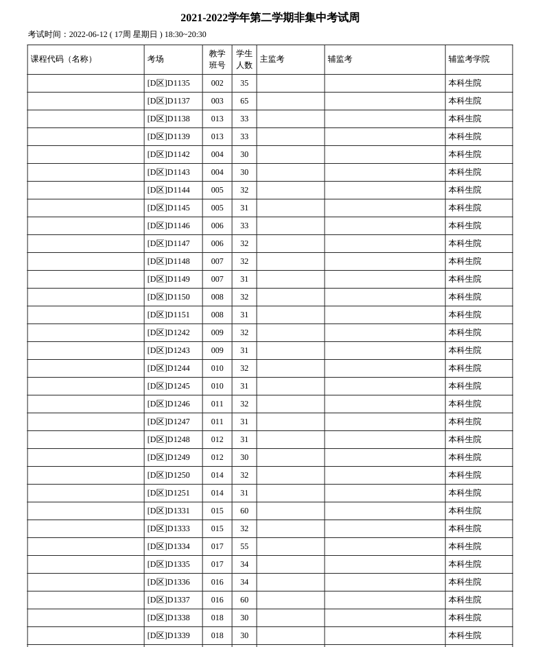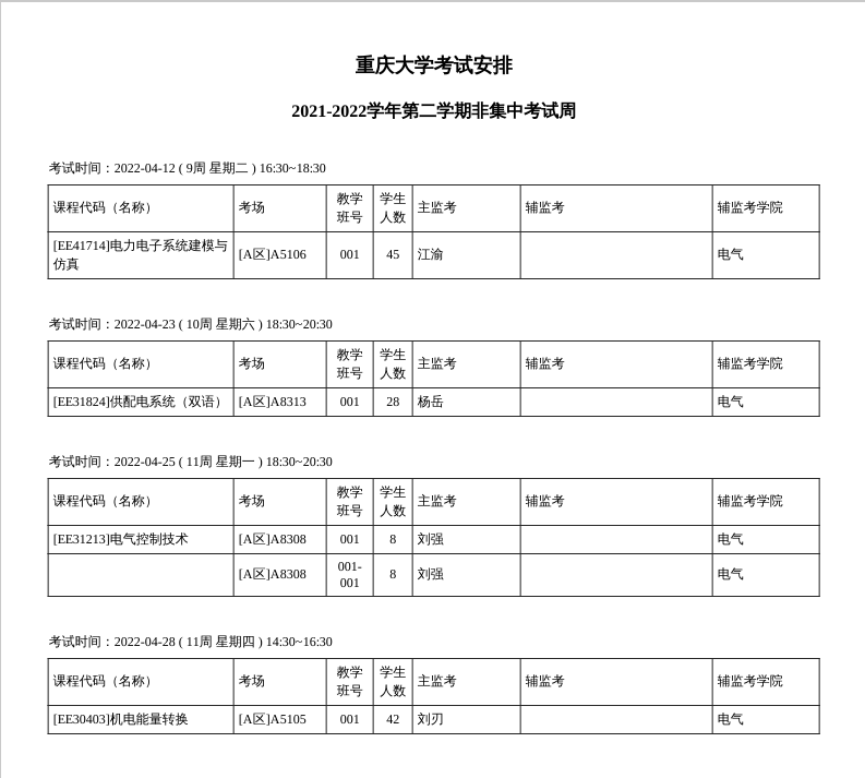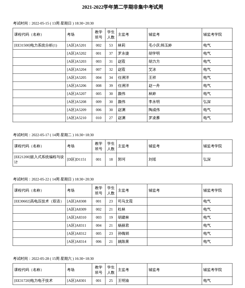 2021-2022第二学期期末集中考试周(18周)考试安排