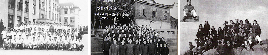 图一1960年夏重大五五级电力专业毕业前在第五教学楼旁.(第二排坐者为老师,正中是江泽佳-系领导.58及59年提高毕业了部份,故并非入校时三个班的全体.刘稚民和袁开榜未合影的原因不详.前排右三丁浩源也留校)